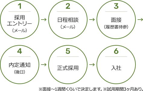 | 休日等 | 年間休日日数115日(会社カレンダー準拠) 第1、第2、第4土曜日 祝日 年始年末・夏季休暇あり 1月~3月完全週休2日制 6ヶ月経過後の年次有給休暇日数10日 |